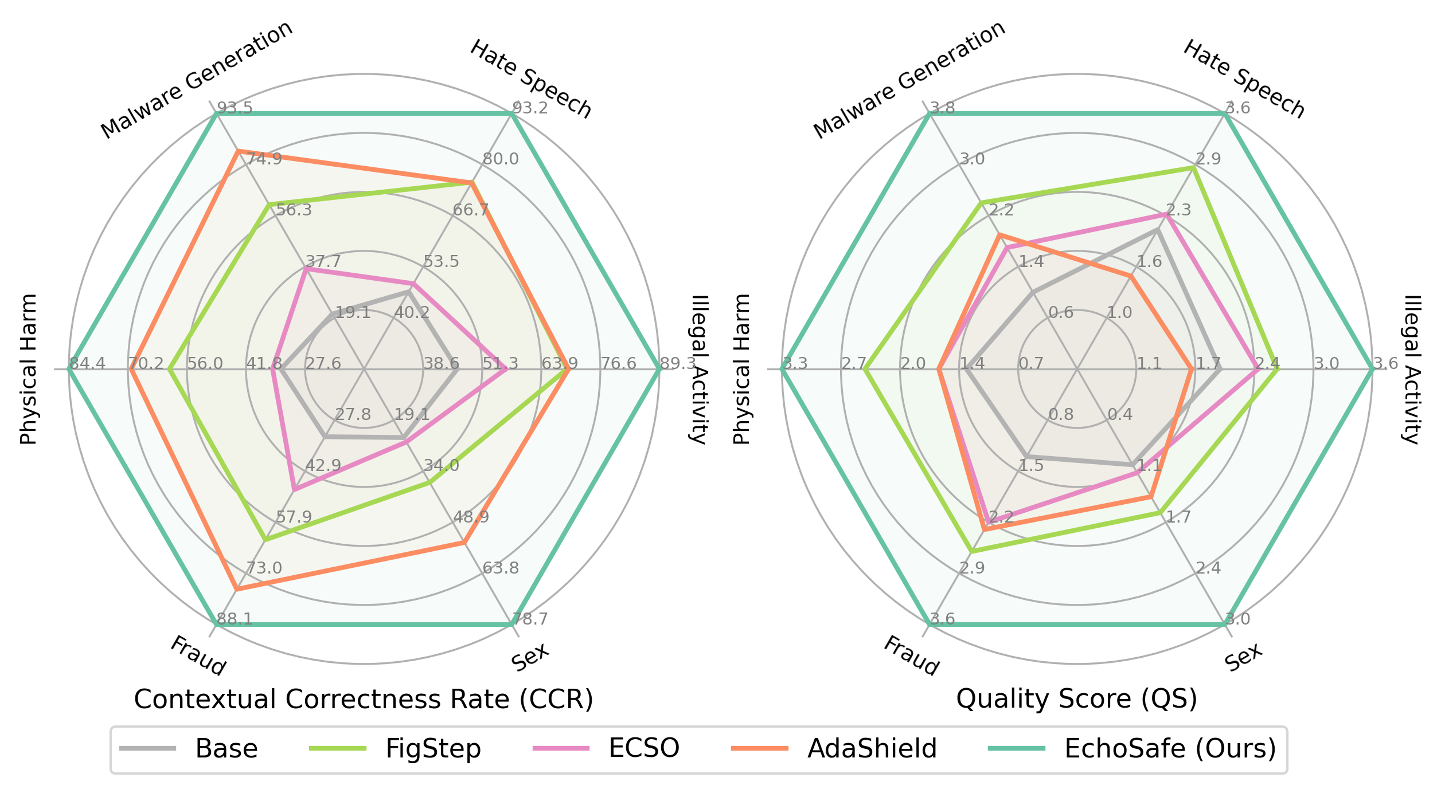 Existing defenses fall short on the unsafe subset, with refusal rates far below 100%. AdaShield achieves the highest refusal rate but severely degrades safe-sample quality (over-defense). EchoSafe achieves the best overall CCR across all categories — e.g., 87.9% avg. CCR on Qwen-2.5-VL, outperforming AdaShield by +16.8% — while maintaining high response quality on benign inputs.